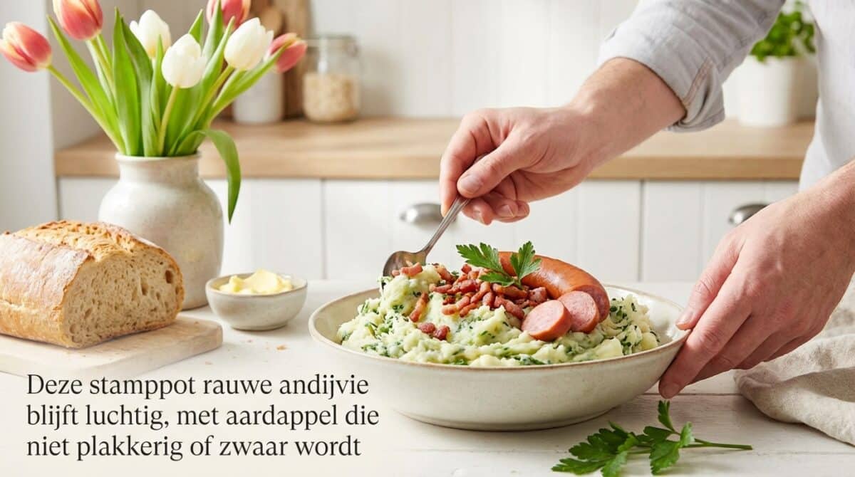 De eerste keer dat ik stamppot rauwe andijvie maakte, was ik bang dat de aardappels zwaar en plakkerig zouden worden. Maar met een paar kleine aanpassingen blijft deze klassieker juist heerlijk luchtig en fris. Perfect voor een lenteavond, wanneer je zin hebt in iets stevigs zonder dat het te zwaar valt.
