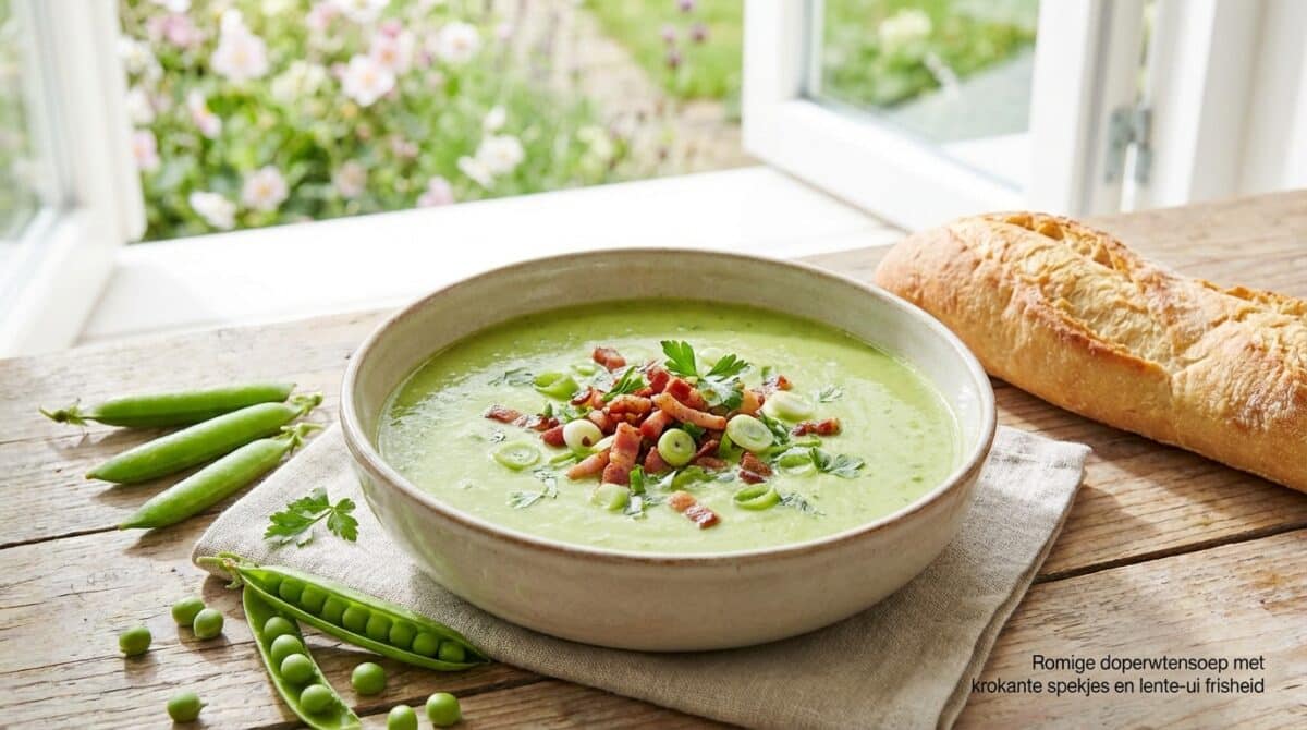 In het vroege voorjaar is er weinig zo verfrissend als een kom romige doperwtensoep. De zachte, zoete smaak van verse doperwten gaat perfect samen met de knapperige spekjes en de frisse smaak van lente-ui. Dit recept brengt voor mij meteen de lente op tafel: warm, maar toch licht.